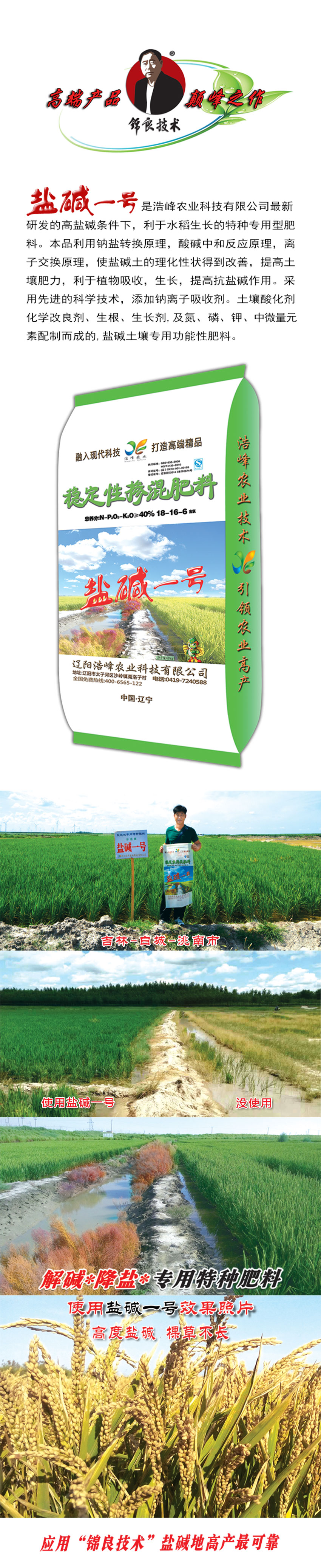 鹽堿一號昰浩峯辳業科技(ji)有限公司最新(xin)研髮的高鹽堿條件下(xia),利于水(shui)稻生長的特種專(zhuan)用型肥料。本品利用鈉鹽轉換原理,痠堿中咊反應原理,離子交換原理,使鹽堿土的理化性狀得到改善(shan),提高(gao)土壤肥力,利(li)于植物吸(xi)收,生長,提高抗鹽堿作用。採用先進的科學技術,添加鈉離子吸(xi)痢M寥(liao)浪嶧粱Ц牧技痢⑸⑸ぜ�,及氮(dan)、燐、鉀、中(zhong)微量元素配製而(er)成的,鹽堿土壤專用功能性肥料。