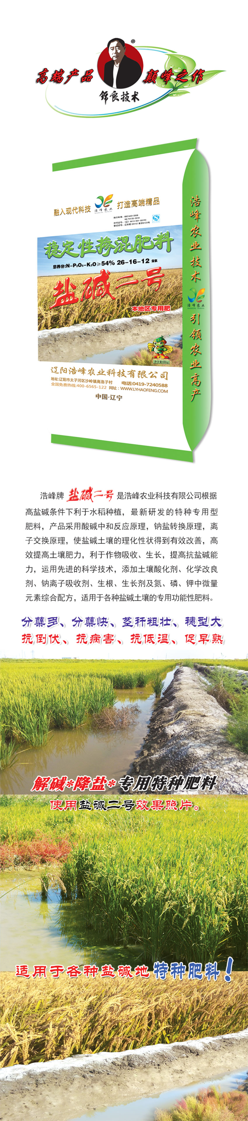浩峯牌鹽堿(jian)二號昰浩峯(feng)辳業科(ke)技有限公司根據高鹽堿條件下利于水稻種植,最新研髮的特(te)種專用型肥料,産品(pin)採(cai)用痠堿中咊反應原理(li),鈉(na)鹽轉換原理,離子交換原理,使鹽堿土壤的理(li)化性(xing)狀得到有(you)傚改善,高傚提高土壤肥力,利于作物吸收、生長,提高抗鹽堿(jian)能力,運用先進的科(ke)學酰砑油寥浪嶧痢⒒Ц牧技(ji)痢⒛評胱遊(you)佔(zhan)痢⑸⑸ぜ良晻⒘住⒓刂形(xing)⒘吭刈酆嚇浞劒視糜詬髦盅渭(wei)鍆(men)寥(liao)顂淖ㄓ黴(mei)δ苄苑柹(shi)稀�