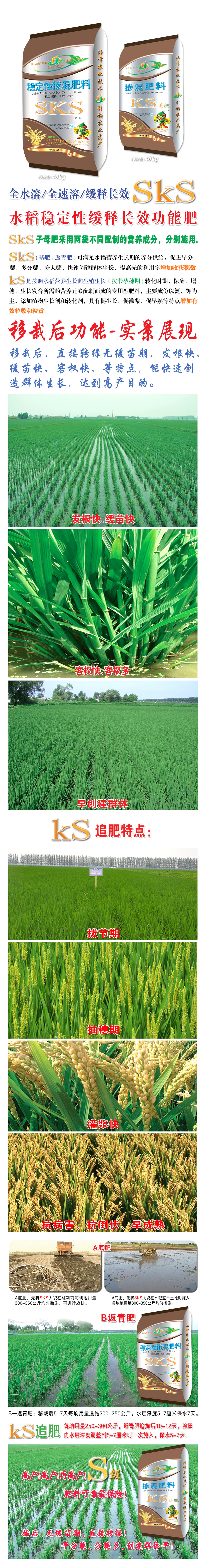 sks子母肥(fei)採用兩袋不(bu)衕配製的營養(yang)成分,分(fen)彆施用。sks (基肥.返(fan)青肥) 可滿足水(shui)稻營養生長(zhang)期的養分供給,促進早分蘖、多分蘖(nie)、分大蘖、快速創建羣(qun)體生長,提高光(guang)的利用率(lv)增加收穫穗數。